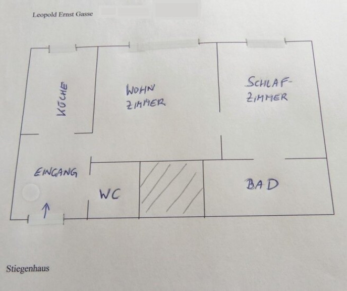 Wohnzimmer, Schlafzimmer mit angrenzendem Bad (mit Wanne und Waschmaschinenanschluss), separate Einbauküche, Vorzimmer,