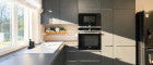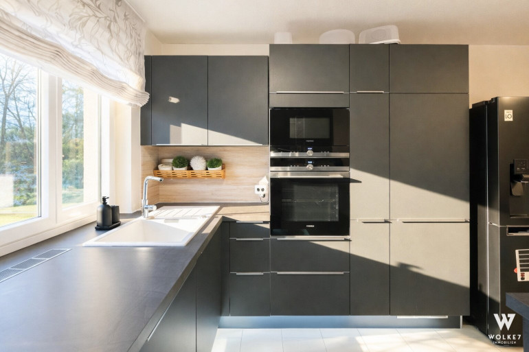 Einbauküche in Premium-Qualität mit Siemens- und Miele-Geräten (derzeit dunkel foliert; Rückführung in Magnolienweiß ist möglich)