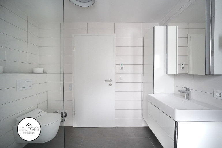 Das modern ausgestattete Badezimmer ist mit einer großzügigen Dusche, WC und Waschtisch versehen und zeitlos gefliest. Der Sanitärbereich verfügt über einen direkten Balkonzugang, der eine zusätzliche natürliche Lüftung ermöglicht.