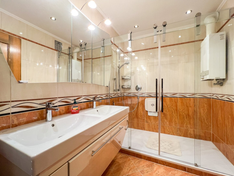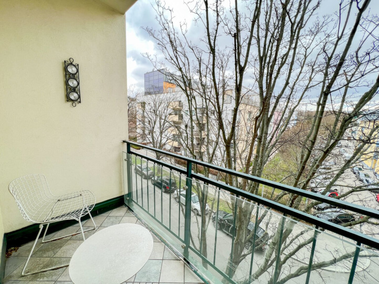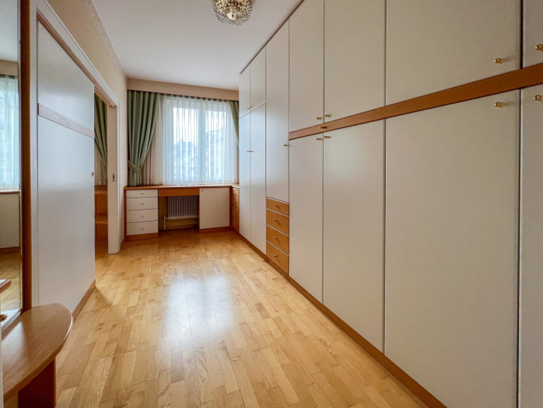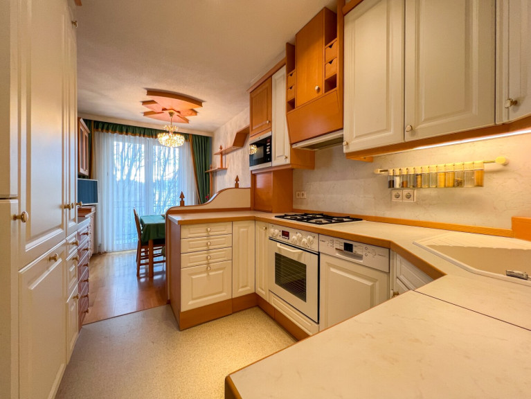 Der zentrale Vorraum führt in das ruhige Schlafzimmer mit anschließendem Schrankraum, das voll möblierte helle Wohnzimmer und in die Küche mit großzügigem Essbereich sowie dem Zugang zur Loggia. Das Badezimmer mit Doppelwaschbecken und großer Dusche sowie das separate WC sind ebenfalls über das Vorzimmer zu erreichen.