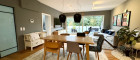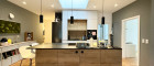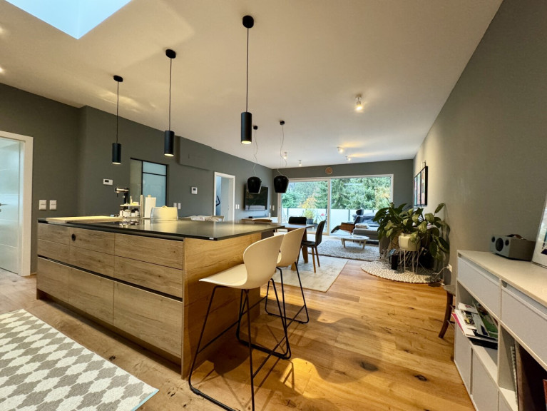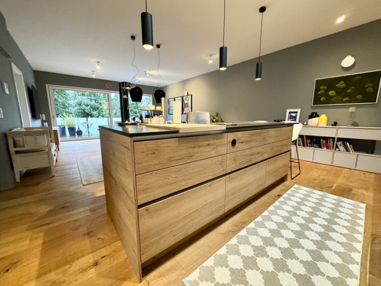 Die offene und qualitätsvolle Küche mit Kücheninsel und Steinplatte ist u.a. mit Bora-Herd, Bosch- Backofen, Kühl-/Gefrierkombination und Siemens-Geschirrspüler ausgestattet.