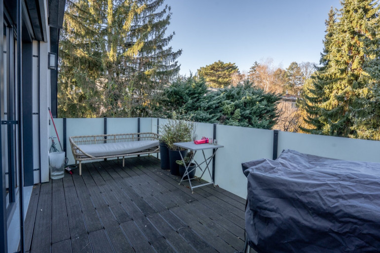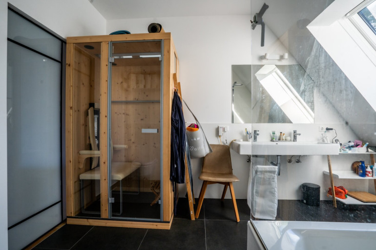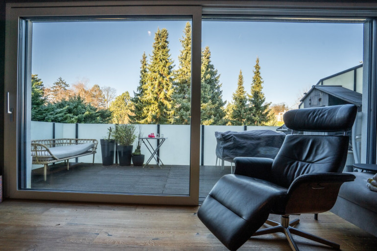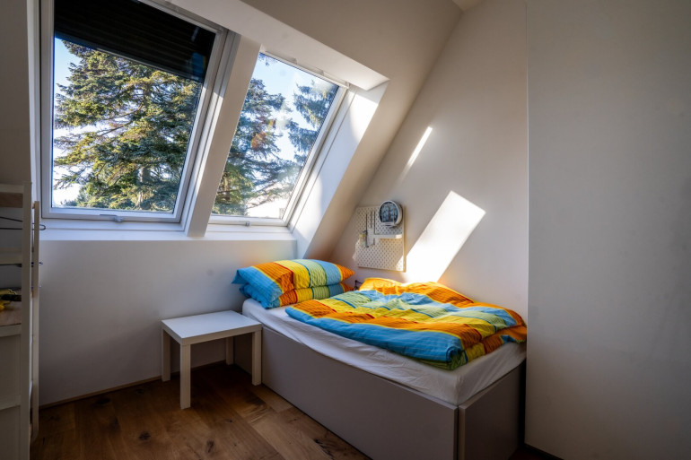 Eichenparkett und Fußbodenheizung sorgen in allen Wohnräumen für natürliche Behaglichkeit. Dank der großen, dreifach verglasten Kunststoff-Alu-Fenster sowie einem großen Dachfenster fällt hier über den ganzen Tag Sonnenlicht ein. Alle Fenster sind mit außenliegenden Raffstores bzw. Jalousien ausgestattet und der Balkon verfügt über eine elektrische Markise mit Windschutz. Des Weiteren ist in allen Zimmern die Verrohrung für den Einbau von Klimaanlagen sowie im Wohnzimmer eine Verrohrung für einen Kamin im Dach vorbereitet.