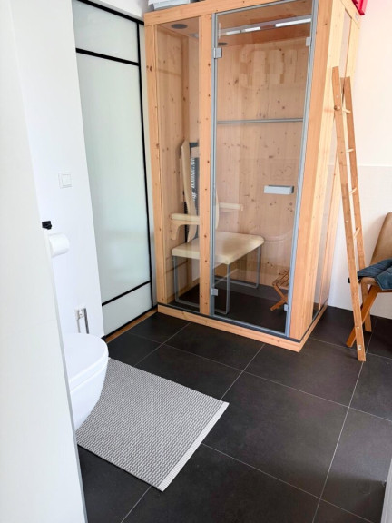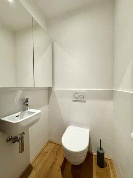 Auf dem an den Wohnbereich anschließenden rund 15 m² großen Süd-/Westbalkon, genießen Sie neben dem Blick ins Grüne, vor allem auch Sonnenstrahlen bis zum Abend! Ein weiteres Badezimmer mit offenem Duschbereich, Waschbecken und Waschmaschinenanschluss, sowie einer separaten Toilette beim Vorraum runden das hochwertige Ambiente ab.