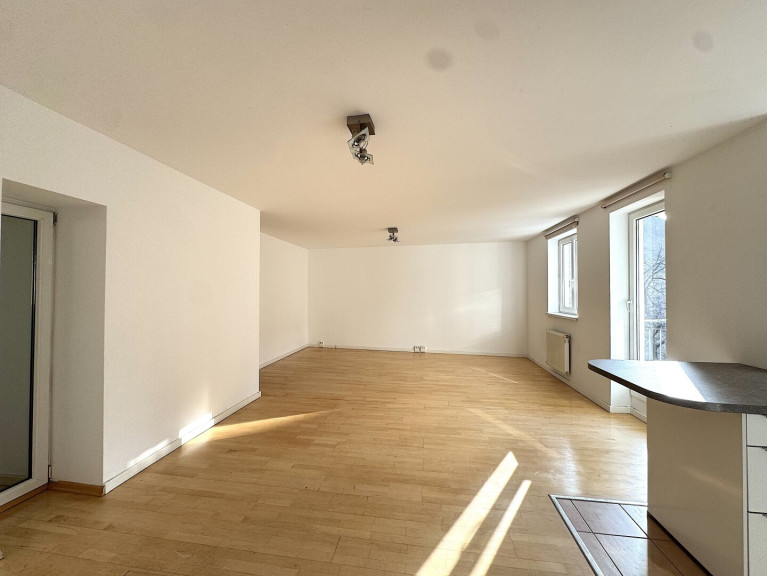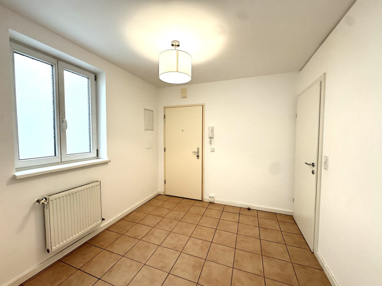 The apartment features a clean and timeless design. Maple parquet flooring runs throughout the living areas, while the bathroom and WC are finished with high-quality stoneware tiles. The windows have plastic frames, the heating is gas-based, and the entire building is in very good condition.