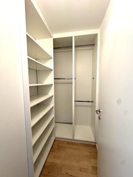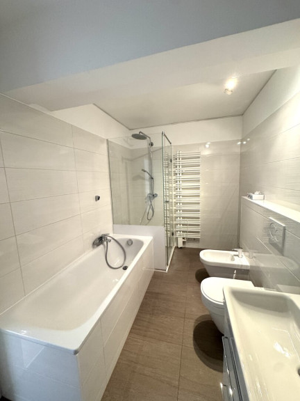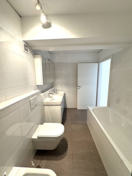 Das großzügige Badezimmer ist mit einer bodengleichen Dusche, Badewanne, Doppelwaschbecken, WC und Bidet ausgestattet. Ein separates Gäste WC befindet sich in unmittelbarer Nähe des Eingangsbereichs. Zusätzlich gehört ein praktischer Einlagerungsraum im Keller zur Wohnung.