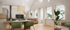 Der großzügige Wohn- und Essbereich bildet das Herzstück der Wohnung und wird durch eine Raumhöhe von bis zu ca. 4,5 Metern sowie große Fensterflächen eindrucksvoll in Szene gesetzt. Licht, Offenheit und Eleganz schaffen ein Wohngefühl, das man selten findet. Der stilvolle Kamin verleiht dem Raum zusätzliche Wärme und Atmosphäre.