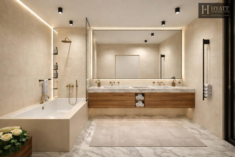 Die Küche ist hochwertig integriert und fügt sich harmonisch in den Wohnbereich ein – ideal für anspruchsvolles Wohnen und repräsentative Abende. Die Schlafzimmer überzeugen durch Ruhe, klare Architektur und hochwertige Details. Die Badezimmer präsentieren sich als elegante Wohlfühloasen mit Naturstein, großzügigen Duschen und exklusiver Ausstattung.