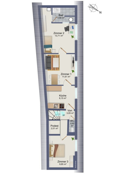 - Zimmer 1: ca. 11,61 m² (Durchgangszimmer)