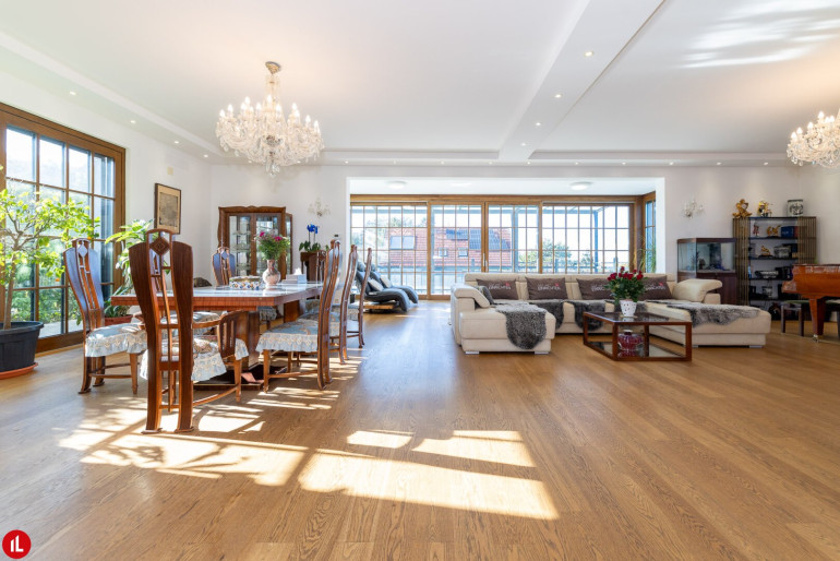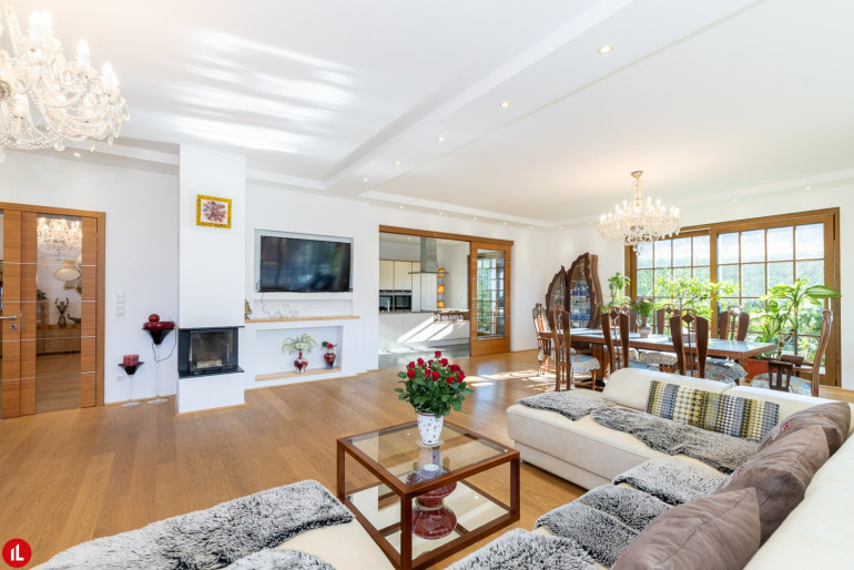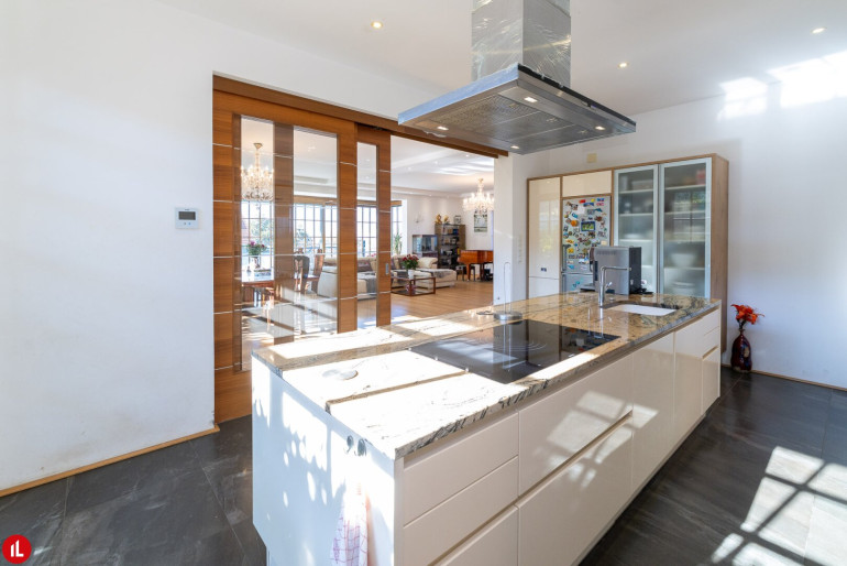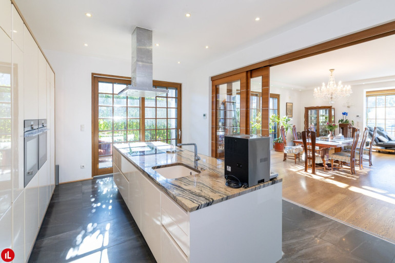 Der zentrale Wohn- und Essbereich öffnet sich fließend zur hochwertig ausgestatteten Küche. Maßgefertigte Einbauten, Natursteinoberflächen und moderne Technik treffen hier auf klassische Proportionen. Ein offener Kamin ergänzt das Ambiente auf zurückhaltende Weise.