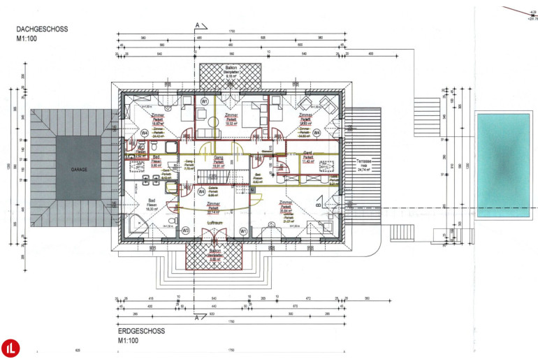 Parkett, Gas, Fußbodenheizung, Kamin, Einbauküche, Bad mit Fenster, Badewanne, Dusche, Parkplatz, Garage, Alarmanlage, Sicherheitskamera, Swimmingpool