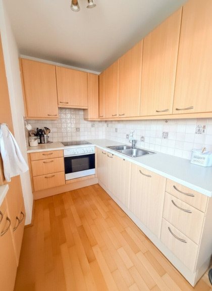 Fliesen, Parkett, Fernwärme, Einbauküche, Wohnküche / offene Küche, Personenaufzug, Westbalkon, Badewanne, Kabel/Satelliten-TV