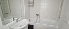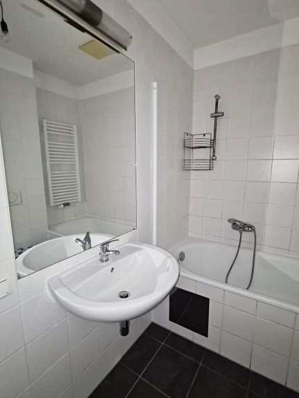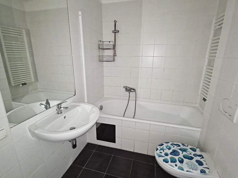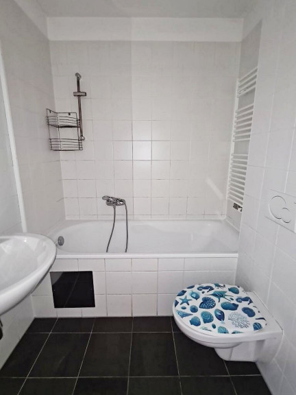+ Badezimmer mit Badewanne, Waschtisch und Waschmaschinenanschluss
