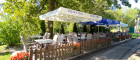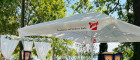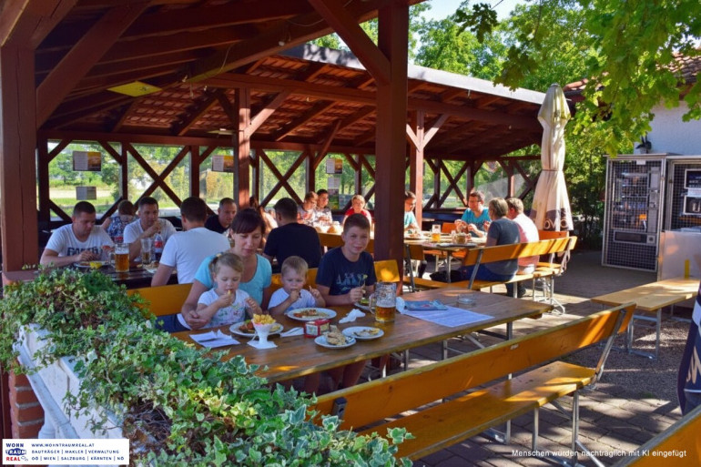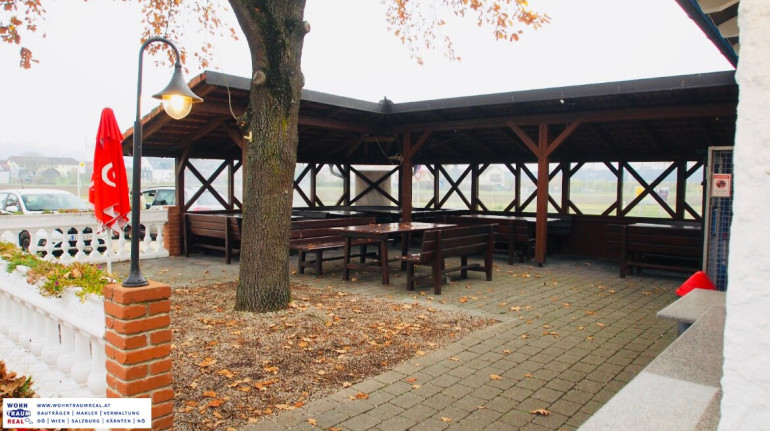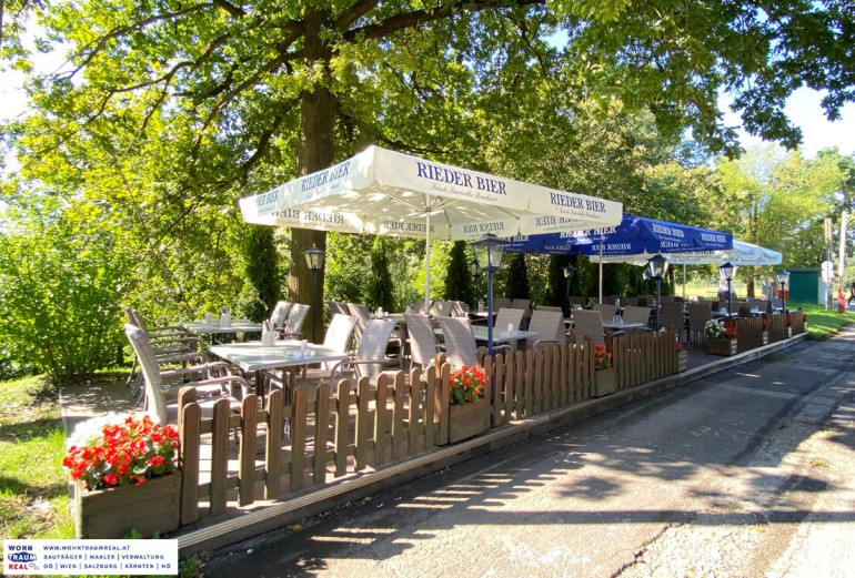 - Zweiter Gastgarten mit Schirmüberdachung, wetterfeste Außentische + -sessel, insgesamt 48 Sitzplätze an 12 Tischen