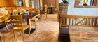Großer, geschmackvoll gestalteter Gastraum mit Holz und Ziegel.
