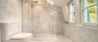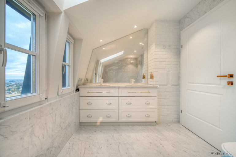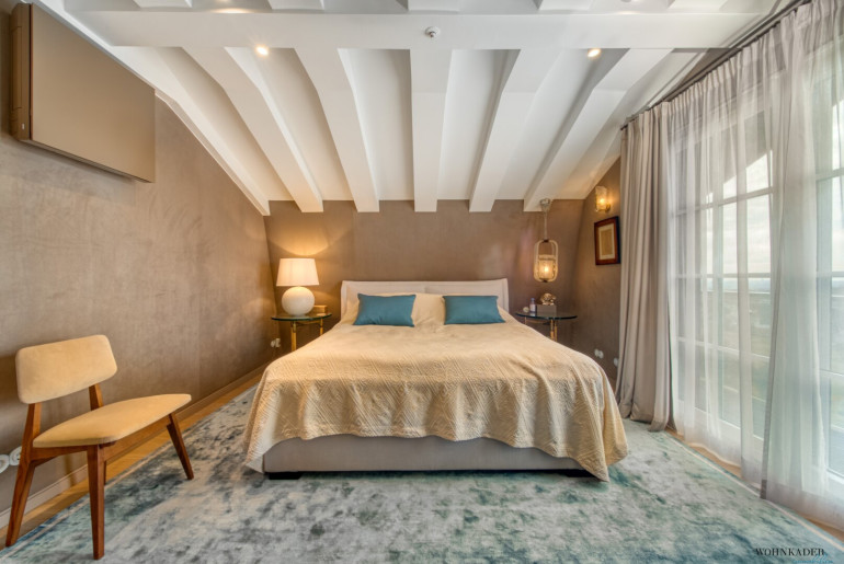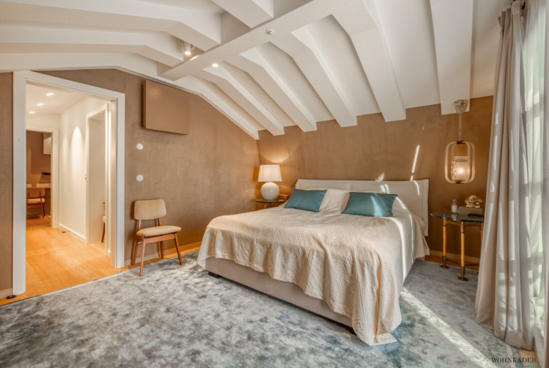 Die oberste Etage bietet zwei separat begehbare Schlafbereiche. Einer davon verfügt über eine private Terrasse mit atemberaubender Aussicht. Auf derselben Ebene befindet sich das exklusive Luxus-Badezimmer, ausgeführt in edlem Marmor und mit hochwertigen Armaturen ausgestattet.