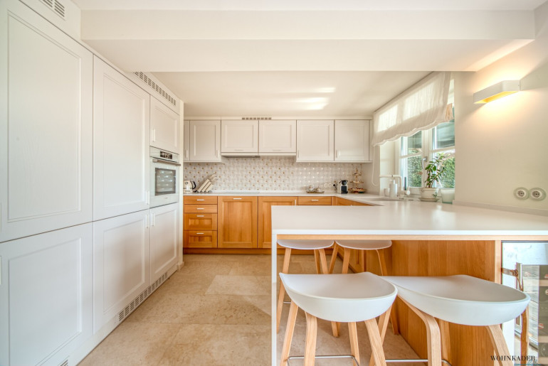 The lower level features a spacious, modern designer kitchen that can be accessed through a private entrance from the terrace. Directly adjacent is a practical storage room, also accessible from the terrace.