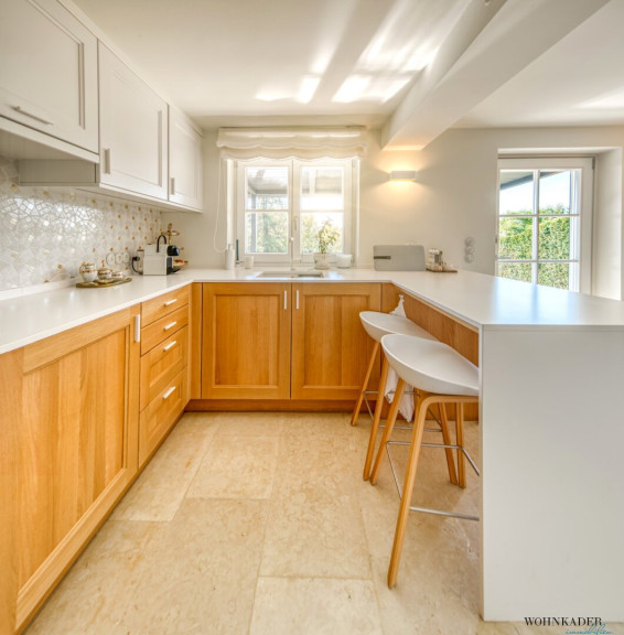 Die untere Etage beeindruckt mit einer großzügigen, modernen Designküche, die über den privaten Eingang von der Terrasse aus erreichbar ist. Direkt angrenzend befindet sich ein praktischer Abstellraum, ebenfalls mit Zugang von der Terrasse.