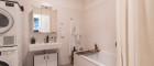 Das Badezimmer ist mit einer Badewanne sowie einem Waschmaschinenanschluss ausgestattet und präsentiert sich – ebenso wie die separate Toilette – in zeitlosem Design.