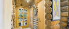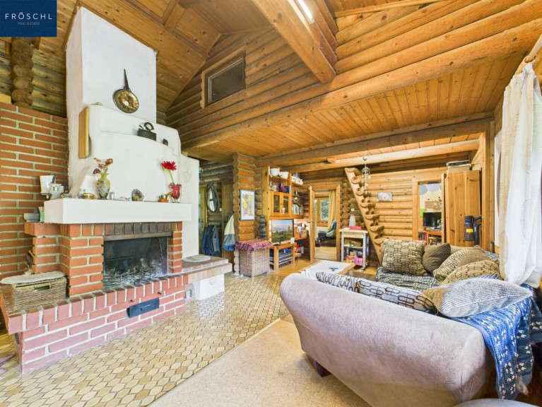 Holzbohlenhaus mit etwa 165 m² Wohnfläche auf drei Ebenen: Charaktervoll, warm und authentisch, mit Balkon und überdachter Terrasse als natürliche Erweiterung in den Garten. Die Beheizung erfolgt über Kachelofen, offenen Kamin und Infrarotpaneele. Eine Sauna mit Holzofen schafft einen zusätzlichen Rückzugsort. Die Küche ist als Vollholzküche aus Erle ausgeführt und mit Dampfgarer, Miele-Kühlschrank und Geschirrspüler ausgestattet.