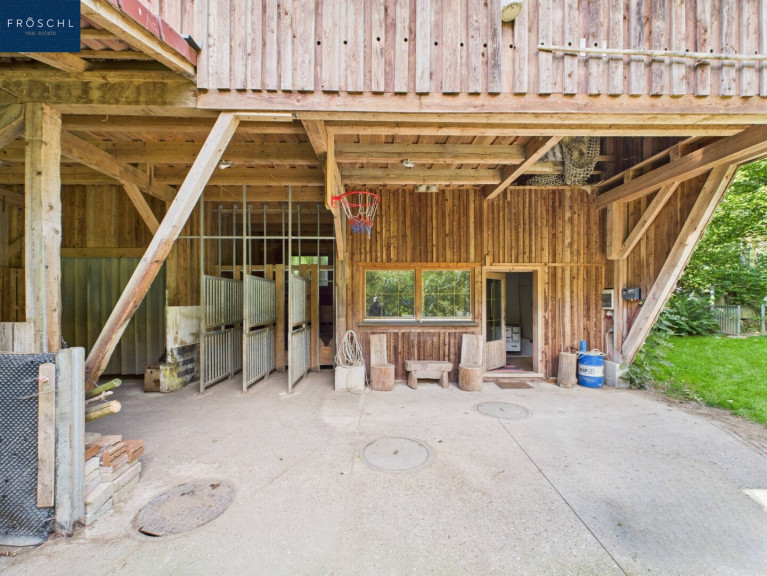 Der Pferdestall verfügt über zwei Ebenen mit insgesamt 170 m² und eignet sich sowohl als Stallfläche als auch als Atelier, Werkstatt oder Lagerbereich. Weitere Nebengebäude ergänzen das Gesamtbild. Brennholz ist vor Ort vorhanden.