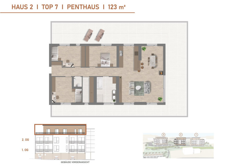 Das 122 m² große Penthaus mit der Top Nummer 7 ist das Herzstück im Mittleren Haus der modernen Wohnanlage.