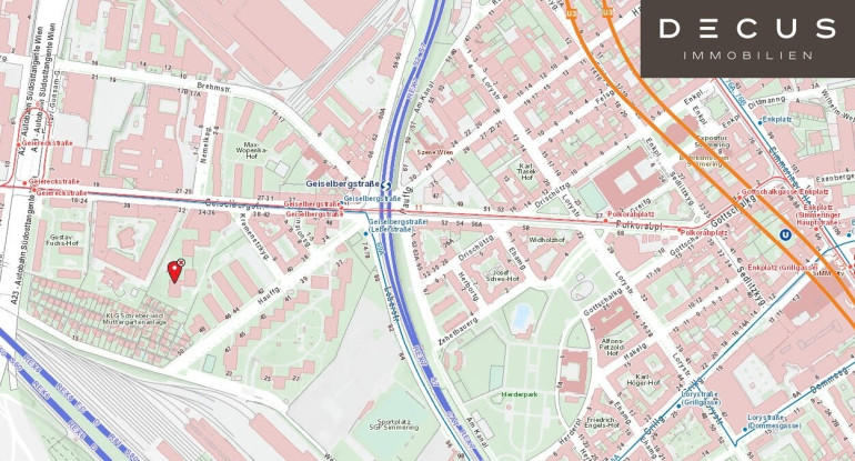 Die Nähe Schnellbahnstation Geiselbergstraße und etliche Buslinien gewährleisten eine gute Verkehrsanbindung.