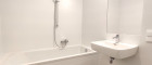 Das en-suite Badezimmer mit einer Badewanne, einem Waschbecken, einem Handtuch-Heizkörper sowie dem Waschmaschinenanschluss runden das Gesamtbild der qualitativ hochwertig ausgestatteten Wohnung ab.