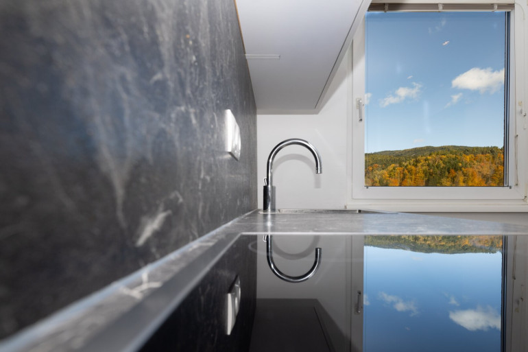 Durch die erhöhte Lage und die vielen Fenster genießt man ganztägig eine helle Wohnatmosphäre und einen weiten Blick über die Dächer von Leoben. - Separate Küche mit Vollausstattung