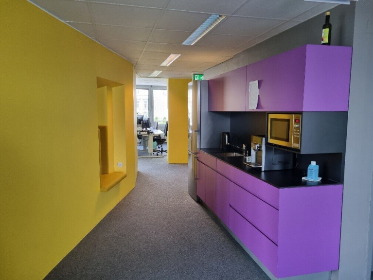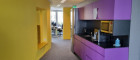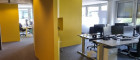 Die 310m² große Etage wurde durch eine renommierte Innenarchitektin mit einem hohen Glasanteil, vor allem aber mit bunten Tischlermöbeln als Raumtrennung, Sitzgelegenheiten und Funktionsmöbeln ausgestattet.