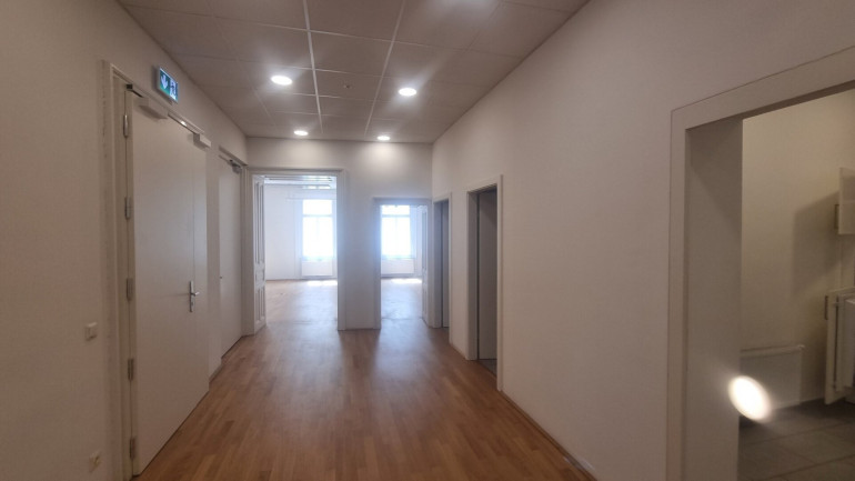 Die vakante Einheit im Mezzanin umfasst knapp 230m² und besteht aus 2 großen straßenseitigen Zimmern mit 66m² respektive 55m², wobei dieses mittels einer mobilen Trennwand problemlos in zwei zentral begehbare Räume unterteilt werden kann.