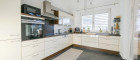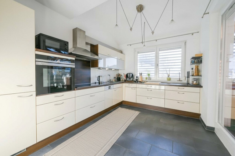 Die moderne, lichtdurchflutete Küche ist mit hochwertigen Einbaugeräten der Firma Siemens ausgestattet und bietet ideale Voraussetzungen für komfortables und stilvolles Kochen.