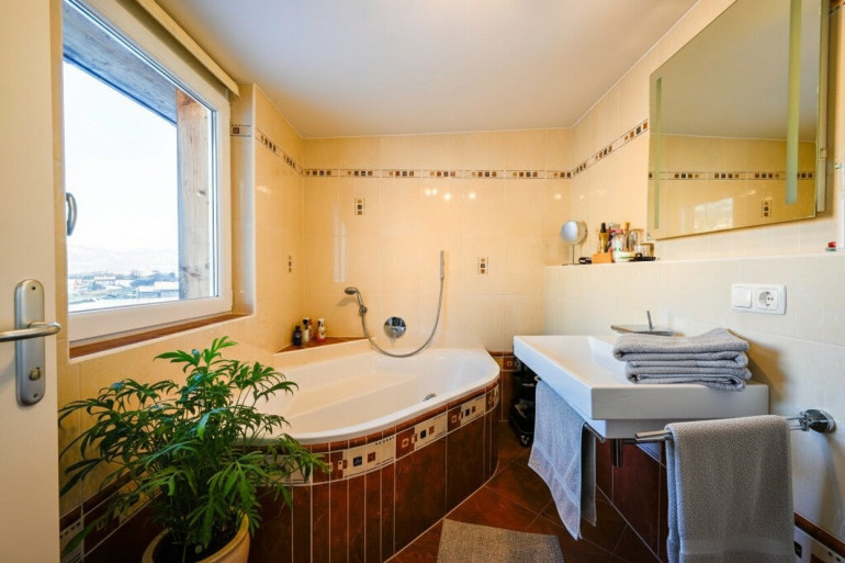 Über eine geschmackvoll gestaltete Stiege gelangt man in das Obergeschoss der Wohnung. Hier befindet sich das Hauptbadezimmer mit Eckbadewanne, Waschtisch und Fenster, das zu entspannenden Wohlfühlmomenten einlädt. Ein zusätzlicher Abstellraum bietet zudem Möglichkeit um nicht alltäglich verwendete Gegenstände zu verstauen.