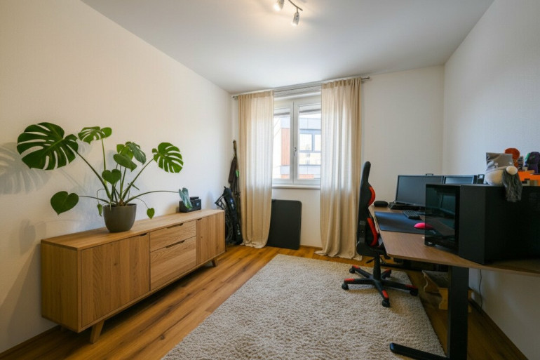 Auf dieser Wohnebene befindet sich zudem ein Kinderzimmer bzw. Büro, das mit einem separaten Bad ausgestattet ist. Dieses verfügt über Waschtisch, Dusche sowie einen Waschmaschinenanschluss und bietet dadurch ein hohes Maß an Flexibilität und Komfort. Ein abgetrenntes Gäste-WC ergänzt das Raumangebot auf dieser Ebene.