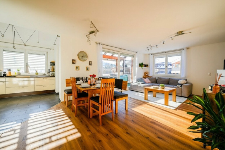 Der großzügige Wohn- und Essbereich bildet das Herzstück der Wohnung und überzeugt mit einer offenen, freundlichen Atmosphäre. Große Fensterflächen sorgen für viel Tageslicht und ermöglichen den direkten Zugang zur Terrasse, welche mit einer Glasüberdachunggeschützt zum Entspannen und Genießen im Freien einlädt.