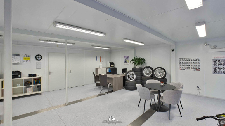 Weiters ist eine Garage / Diagnoseraum mit ca. 40 m² (Ziegelmassiv) sowie ein Lagerraum, eine kleine Küche und ein barrierefreies WC vorhanden.
