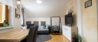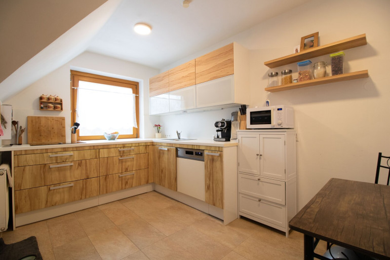 Die moderne Einbauküche lädt zum Kochen und Verweilen ein und bietet den perfekten Rahmen für gesellige Abende. Das angrenzende, helle Wohnzimmer eignet sich ideal für entspannte Stunden.