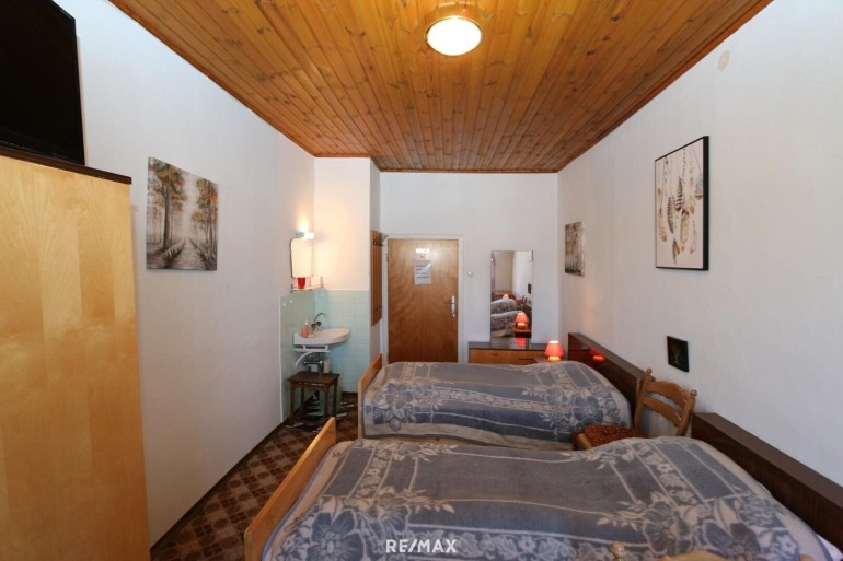* EG: Flur mit Garderobe, Küche, Wohnzimmer, 2 Zimmer mit Bad (Dusche und WC), 1 Zimmer mit Waschbecken, 1 ehem. Frühstücksraum mit Küche, WC