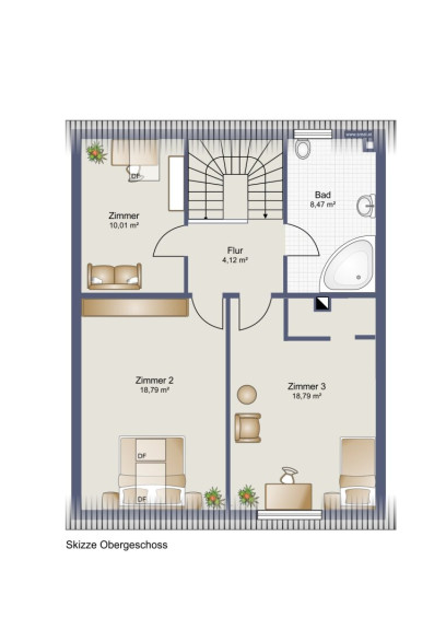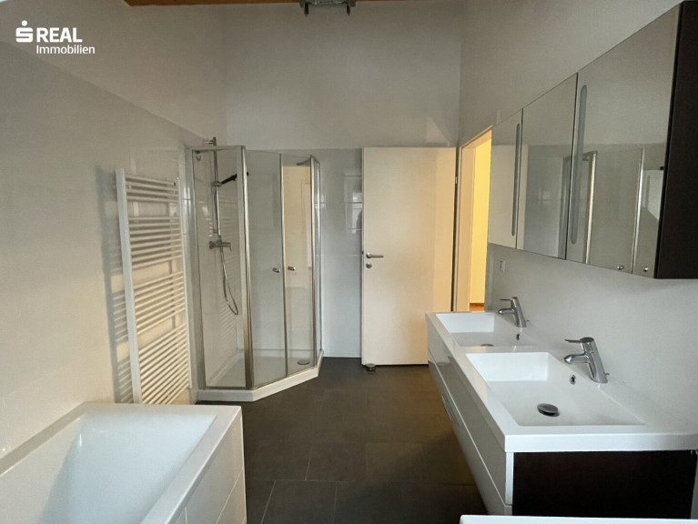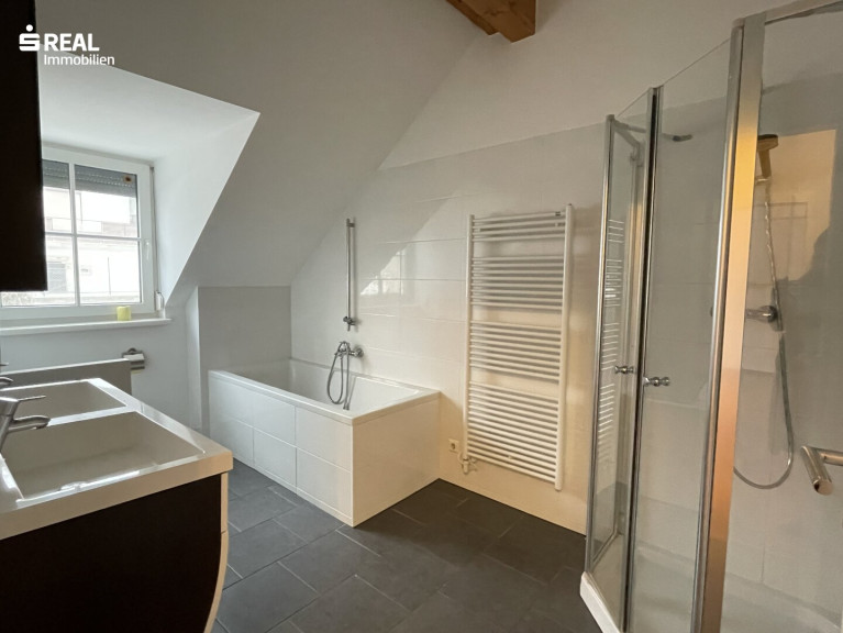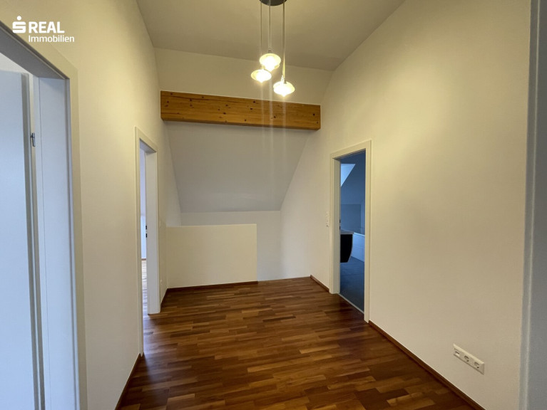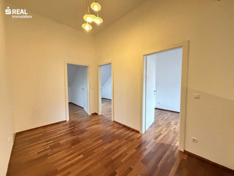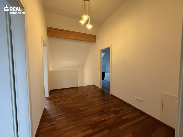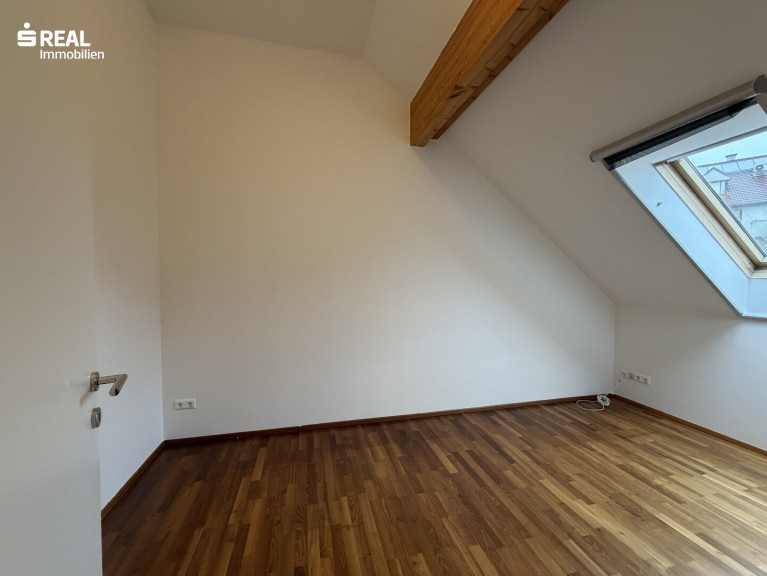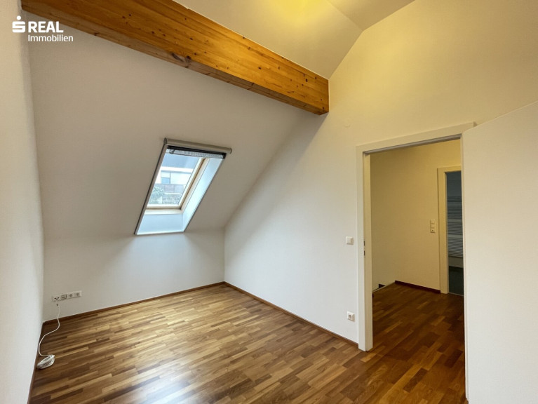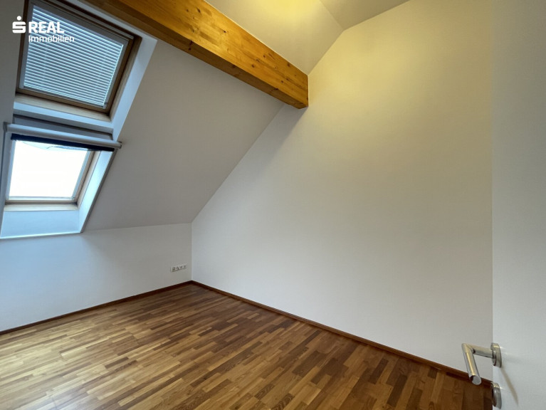 Im Dachgeschoss stehen drei Schlafzimmer zur Verfügung – perfekt für Eltern, Kinder oder ein zusätzliches Arbeits- oder Gästezimmer. Ein Schlafzimmer verfügt über eine begehbare Garderobe. Das Badezimmer ist familiengerecht ausgestattet mit Dusche, Badewanne und WC. Die hohe Raumhöhe und die angenehm gesetzte Kniestockhöhe sorgen dafür, dass sich die Räume offen, hell und großzügig anfühlen.