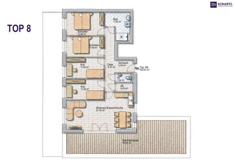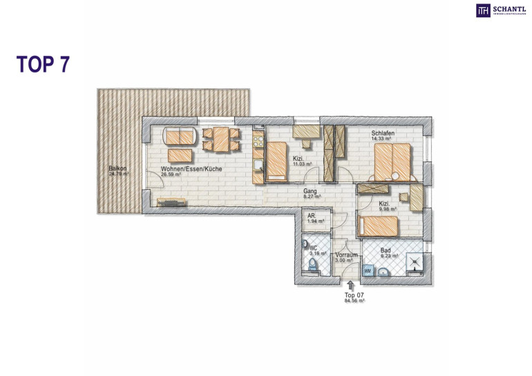 - Wohnen/Essen/Kochen auf 23,81m² und Zugang zum Balkon