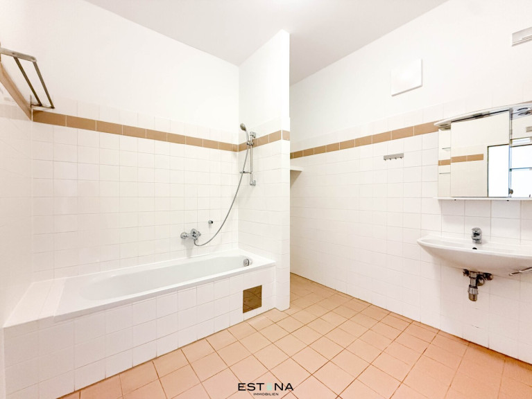 - Badezimmer mit Badewanne, Waschbecken und Waschmaschinenanschluss