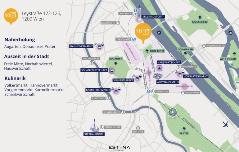 Zwischen Donaukanal, Augarten und Donauinsel, wo der kreative Spirit der Leopoldstadt sanft in die grüne Gelassenheit des 20. Bezirks übergeht, wartet ein Zuhause für Menschen mit Stil, Bewusstsein und Sinn für das Wesentliche: SOLEY.