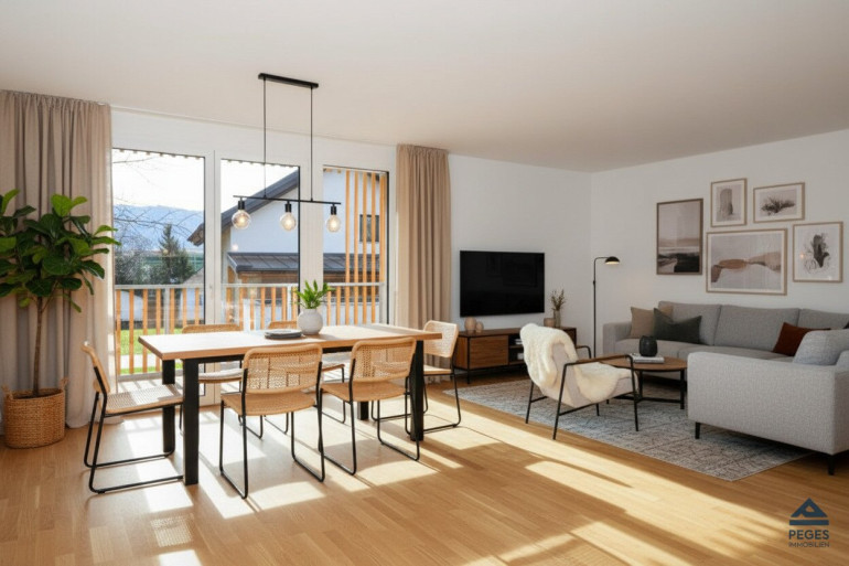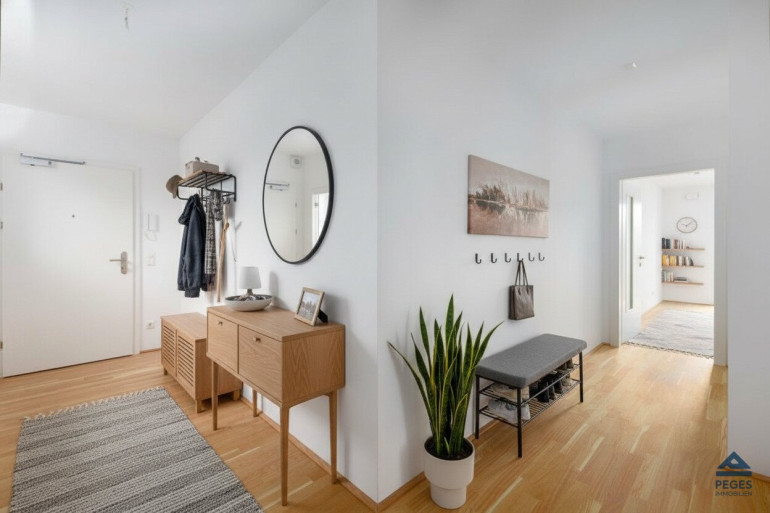 Das freundlich-großzügige Entree führt in das gemütliche Wohnzimmer, das mit einer eleganten Einbauküchenzeile (inkl. allen Geräten samt Geschirrspüler) ausgestattet ist und viel Platz bietet. Zudem ist der Wohnbereich aufgrund der großflächigen Panoramaverglasung mit Zugang zumsonnigen Außenbereich, dem Balkon mit südwestlicher Ausrichtung, hell und lichtdurchflutet. Der Balkon mit ca. 8 m² ist perfekt geschnitten und bietet viel Raum zum Entspannen und Wohlfühlen bei traumhaftem Ausblick. Im Schlafzimmer sorgt ein angenehm ruhiges Wohlfühlambiente für die ideale Schlafumgebung. Modern und elegant präsentiert sich auch das mit einer Dusche sowie WC und schönem Fliesenbelag ausgestattete, taghelle Badezimmer. Ein eigener Waschmaschinen-Anschluss ist im Bad ebenfalls vorhanden. Für ausreichend Stauraum sorgen ein praktischer Abstellraum in der Wohnung sowie ein Kellerabteil.