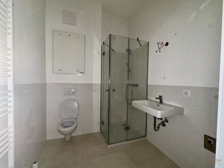 Das moderne Badezimmer ist mit einer großen Dusche und einem WC ausgestattet. Auch ein Abstellraum ist vorhanden. Vom Vorraum aus gelangen Sie in den großen Wohn- Essbereich und hinaus auf die Terrasse. Durch den 2. Vorraum erreichen Sie das große helle Schlafzimmer sowie das Badezimmer.