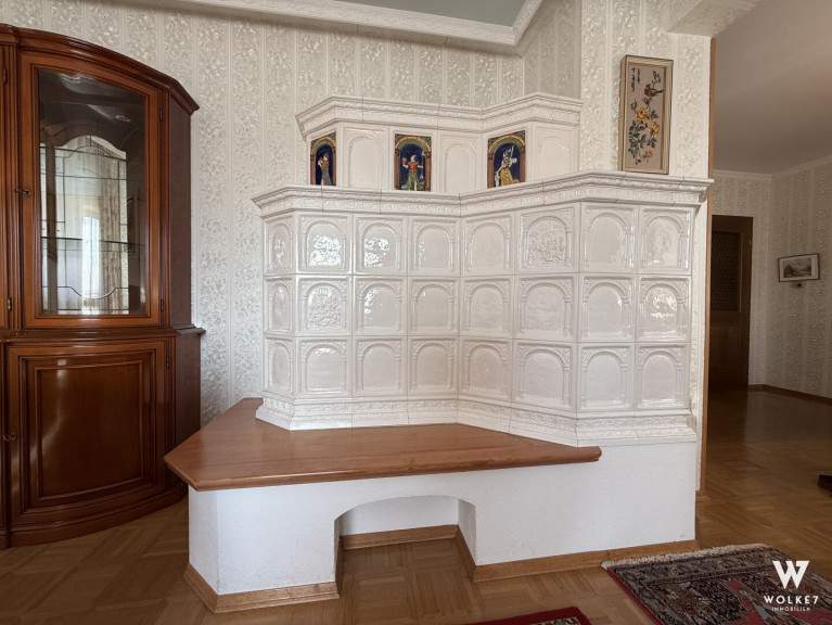 ein großzügiges, sehr helles Wohnzimmer mit wunderschönem Kachelofen unddirektem Zugang zur Terrasse und in den Garten