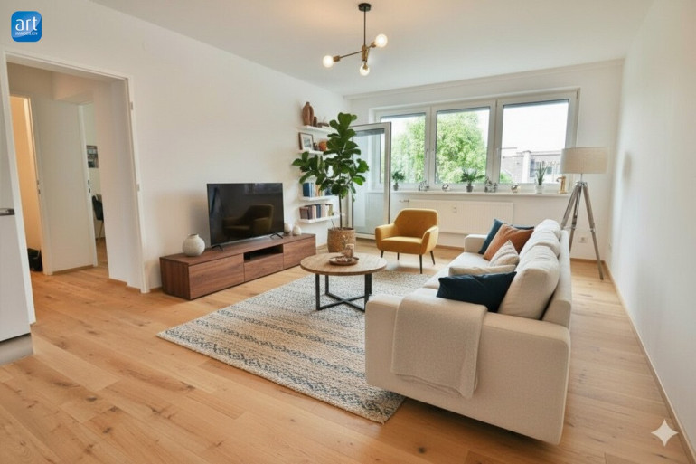 Ein helles Wohnzimmer mit verglaster Loggia, zwei großzügige Schlafzimmer sowie ein weiteres, kleineres Zimmer, das sich ideal als Büro oder Kinderzimmer eignet. Der offen gestaltete Koch- und Essbereich schafft eine moderne Wohnatmosphäre.