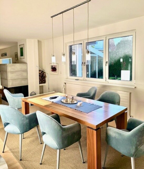 LIVING AREA überzeugt durch fließende Übergänge zwischen Wohnen, Essen und Kochen. Der Wohnbereich mit offenen Kamin bietet Raum für Rückzug wie auch für geselliges Beisammensein. Großzügige Fensterelemente und der Herrlicher Wintergarten holen das Grün des Gartens in den Innenraum und schaffen eine angenehme Verbindung zwischen Innen- und Außenleben. Der Essbereich eignet sich hervorragend und ideal als atmosphärischer Mittelpunkt für lange, gesellige Abende oder Familienfeste, etc. Die Küche präsentiert sich als funktionaler wie kommunikativer Raum, hochwertig ausgestattet und klar strukturiert !