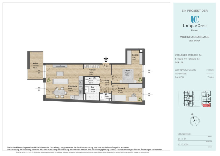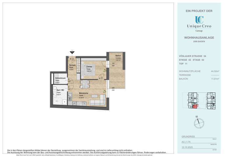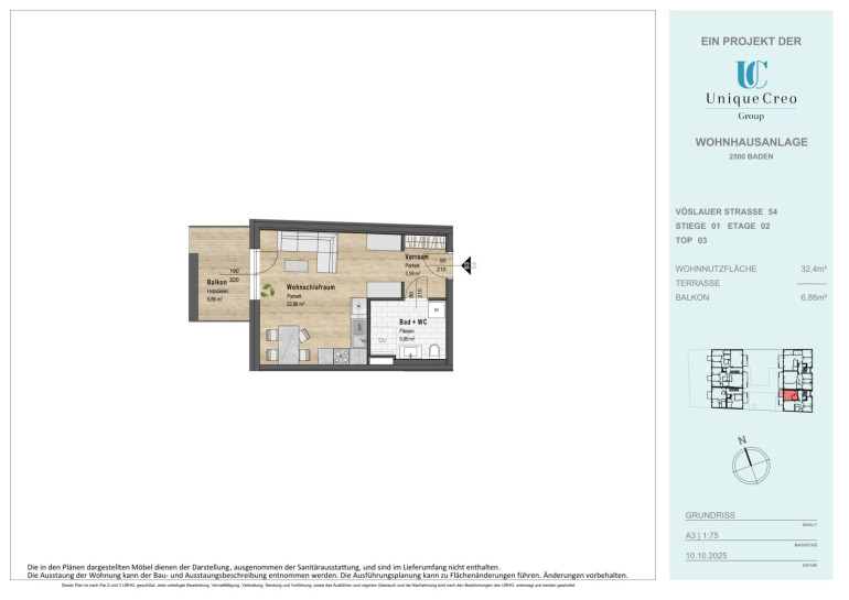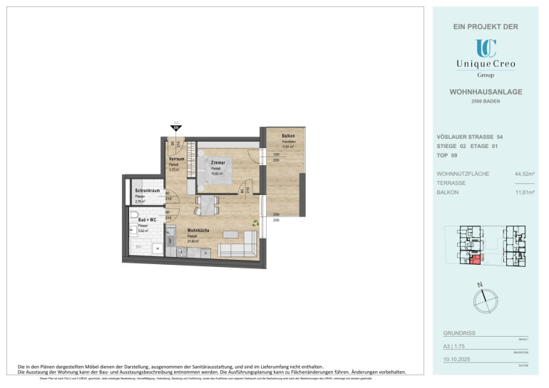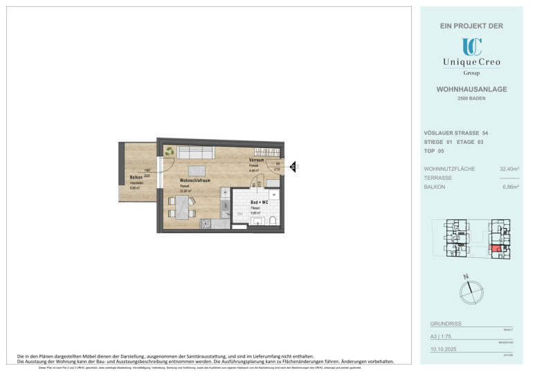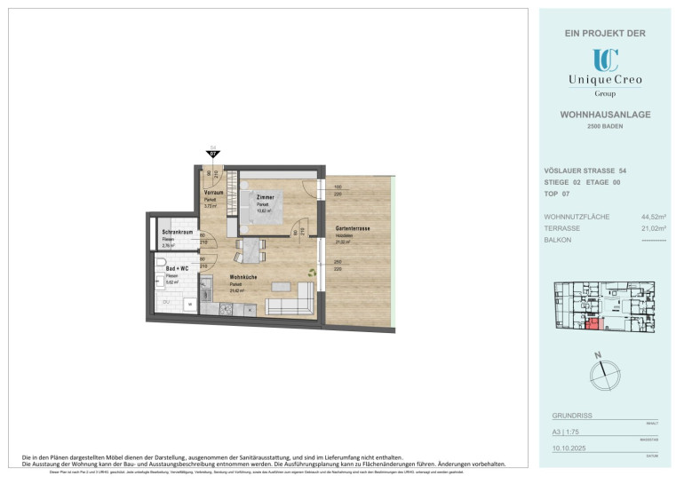 Die Unique Creo Group entwickelt ein exklusives Neubauprojekt in bester Lage von Baden. Auf der Vöslauer Straße 52–54 entsteht eine moderne Wohnhausanlage, die mit ansprechender Architektur, hochwertiger Bauausführung und durchdachter Planung überzeugt. Die zeitgemäßen Grundrisse bieten maximalen Wohnkomfort, gepaart mit stilvollem Design und nachhaltiger Bauqualität. Jede Wohnung bietet einen privaten Außenbereich (Eigengarten, Terrasse oder Balkon) für lichtdurchflutete Wohnräume und sonnige Entspannung.
