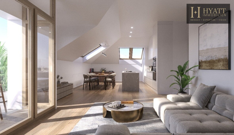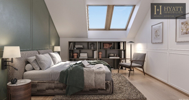 Große Fensterflächen schaffen lichtdurchflutete Räume und unterstreichen das elegante Wohngefühl dieser Dachgeschosswohnung.