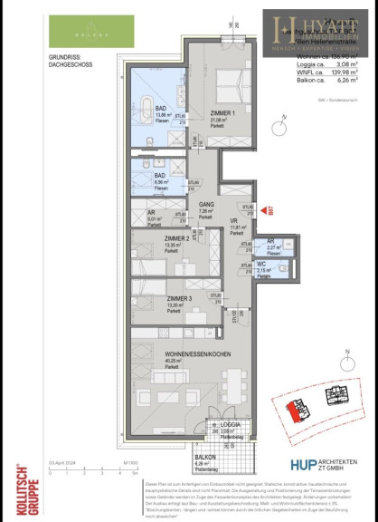 Der großzügige Wohn-/Ess-/Kochbereich mit ca. 40,25 m² bildet das Herzstück der Wohnung und bietet direkten Zugang zur Loggia (ca. 3,08 m²) sowie zum Balkon (ca. 6,26 m²) – ideal für entspannte Stunden im Freien und gemütliche Abende mit Blick ins Grüne.