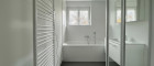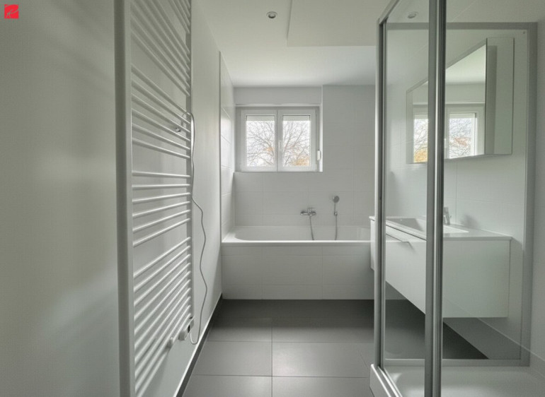 Das Badezimmer ist modern ausgestattet und verfügt über eine Dusche, eine Badewanne sowie ein Fenster für Belüftung. Moderne Fliesen sorgen für ein stimmiges Gesamtbild. Das WC ist separat angeordnet. Beheizt wird die Wohnung mittels Elektroheizung.